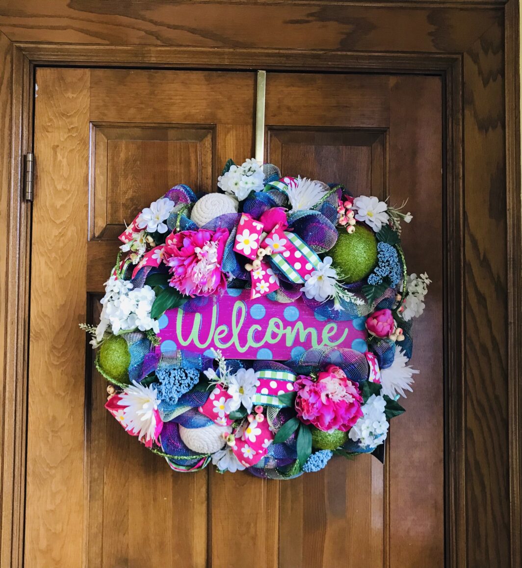 This 24 inch deluxe multi colored mesh wreath has a WELCOME sign in the center surrounded with lots of colorful flowers, decorative wooden balls and decorative ribbon all through the wreath.