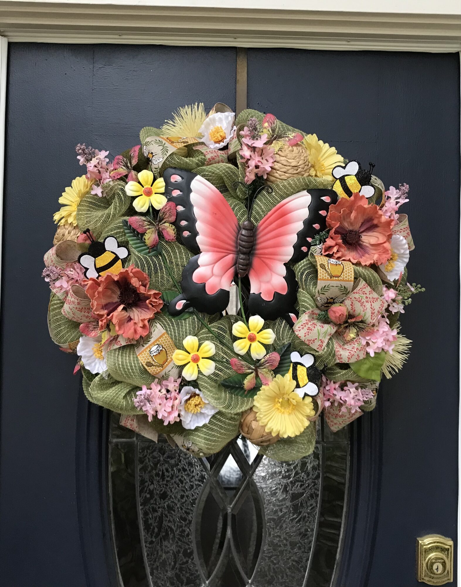 This 24 inch deluxe mesh wreath has a pink butterfly in the center surrounded with lots of flowers, bumble bees and decorative ribbon all through the wreath.