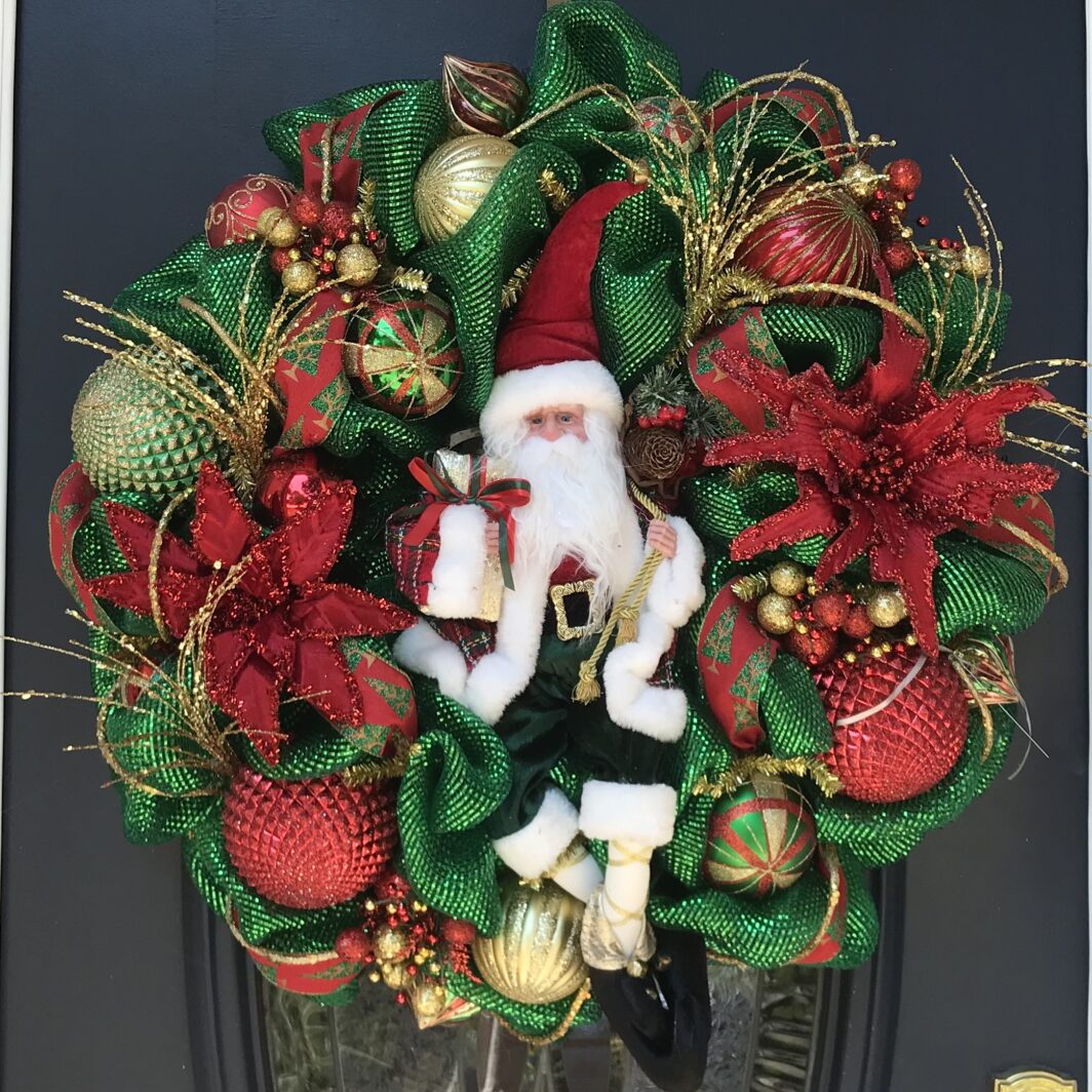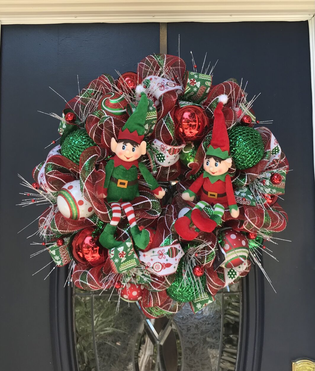 This 24 inch deluxe mesh wreath has two cute elves in it with lots of decorative balls glitter picks and whimsical ribbon all through the wreath.