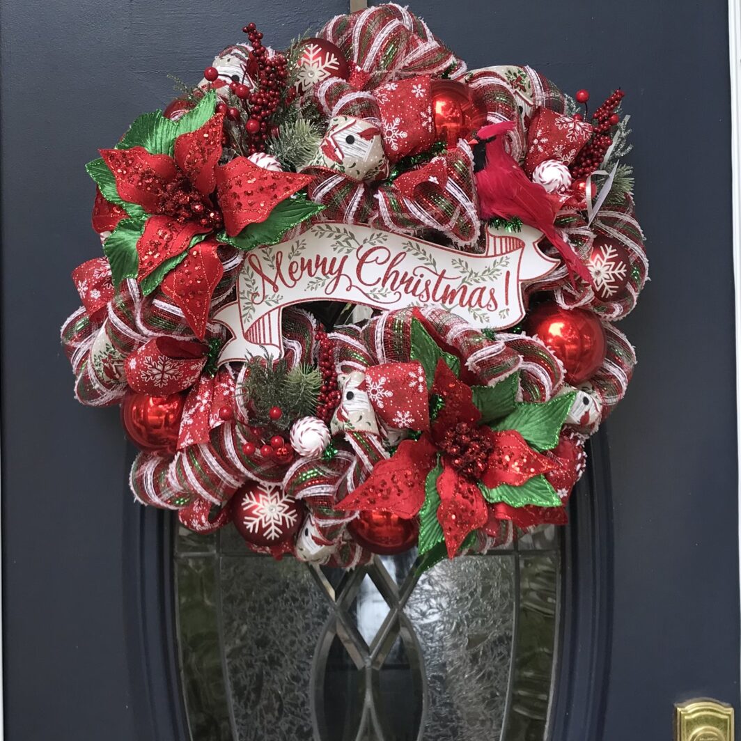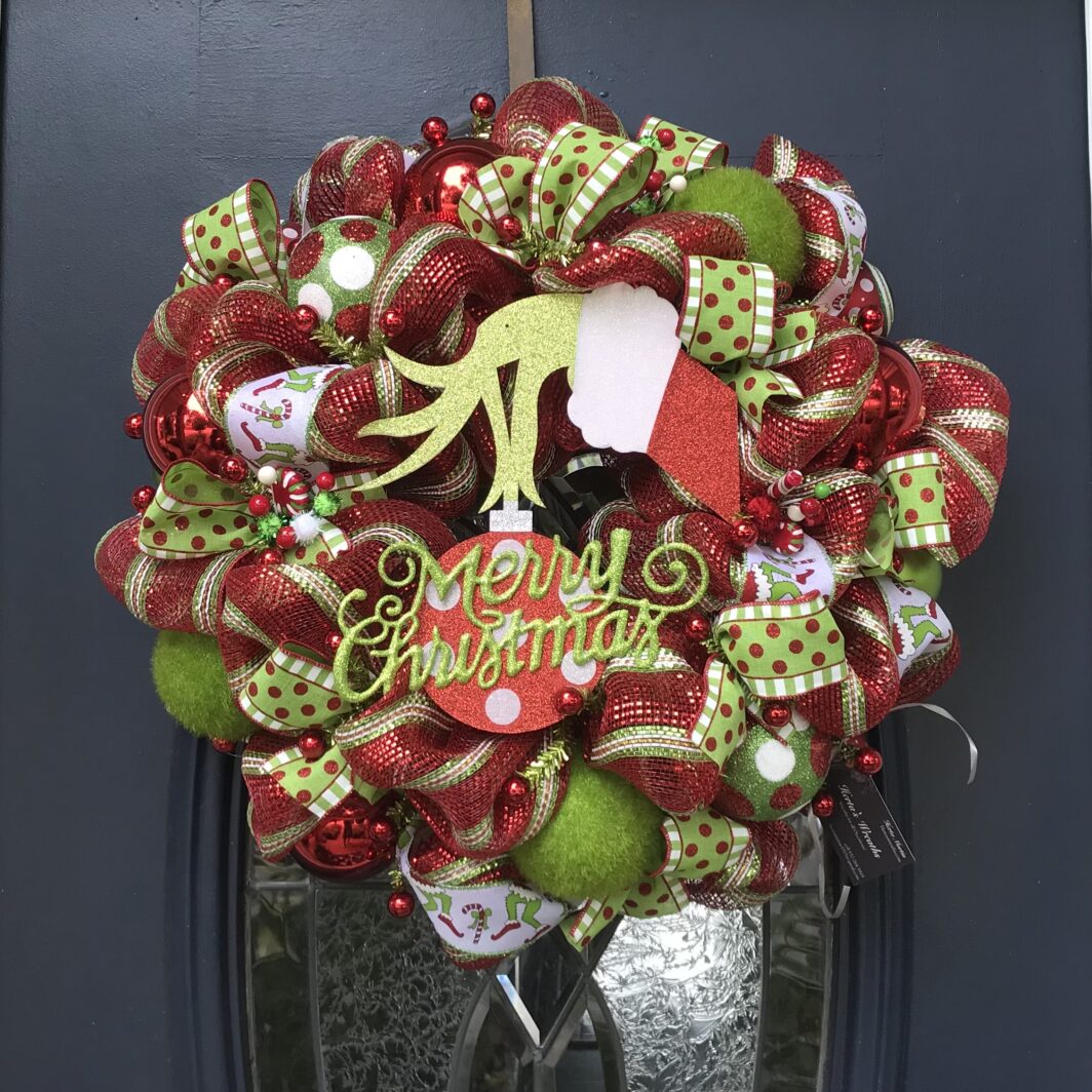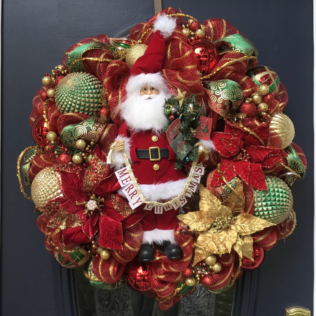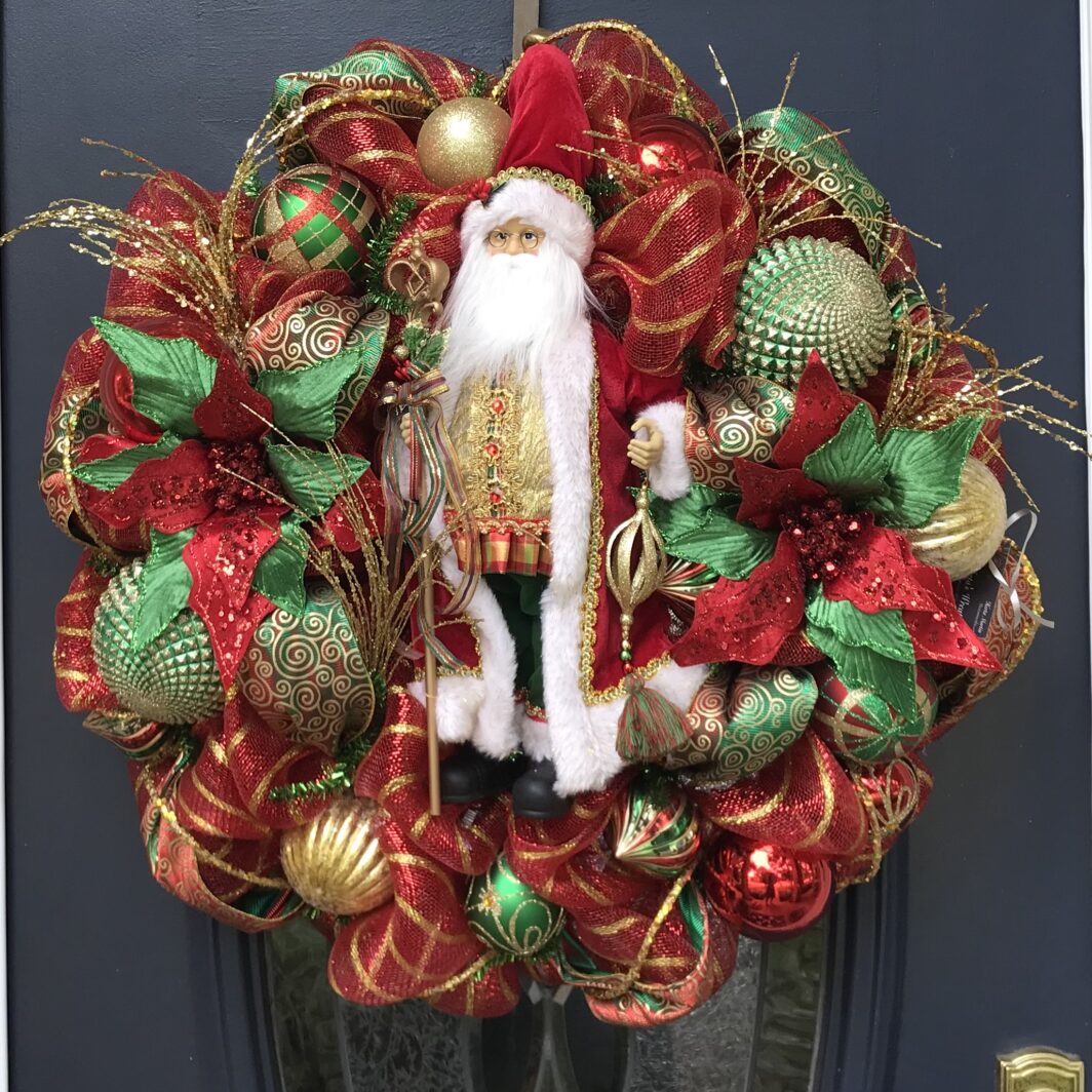 This 24 inch deluxe red, white and emerald green plaid mesh wreath has two elves in it surrounded with decorative balls, glitter picks and decorative ribbon all through the wreath.
