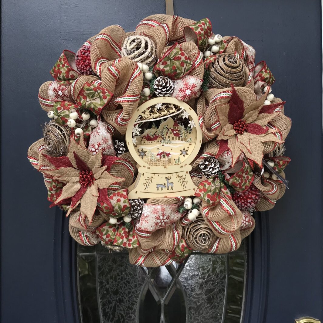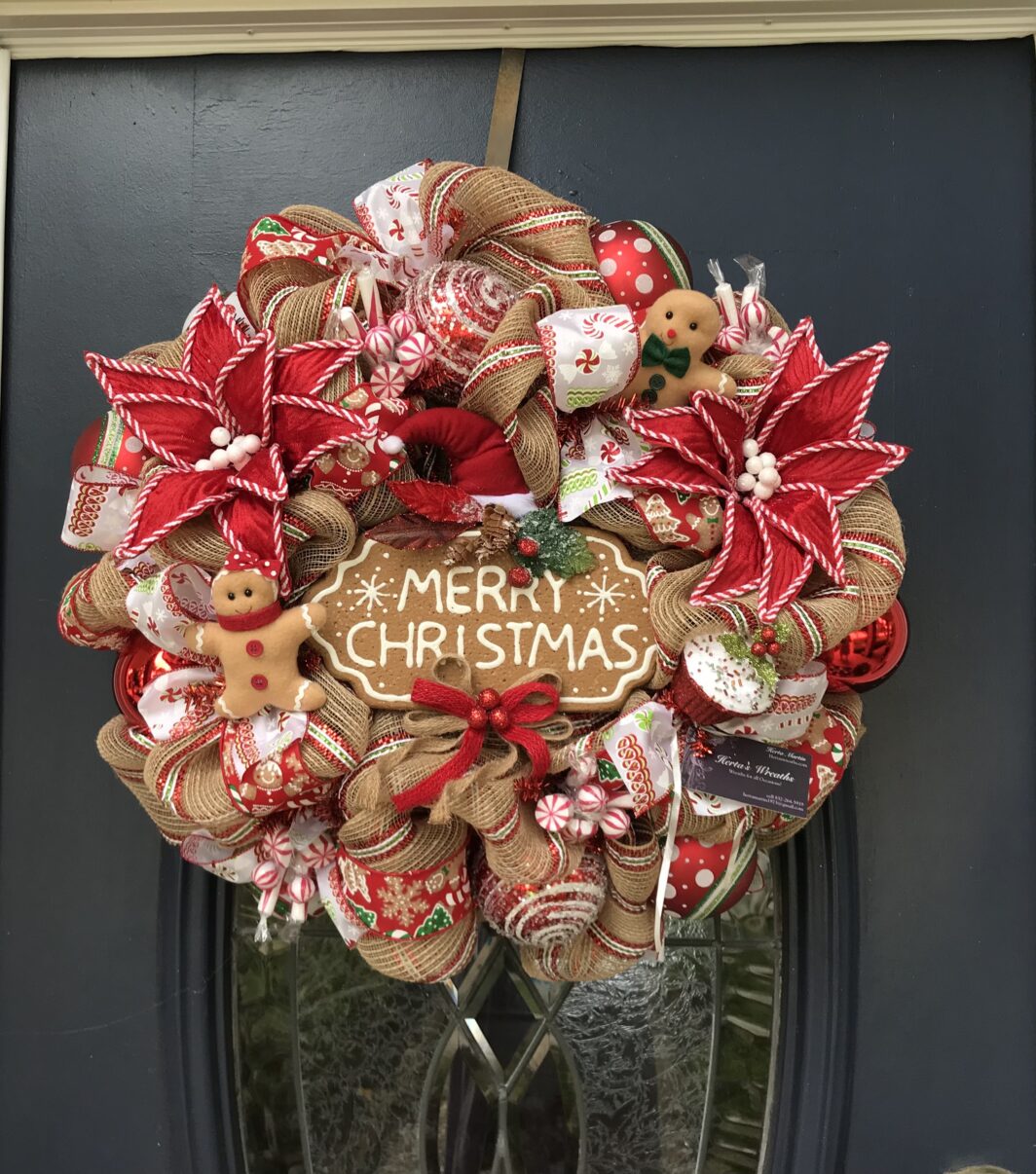 This 24 inch deluxe khaki and red and white stripe mesh wreath has a gingerbread Merry Christmas sign in the middle surrounded with poinsettias, gingerbread men, decorative balls and decorative ribbon all through the wreath.