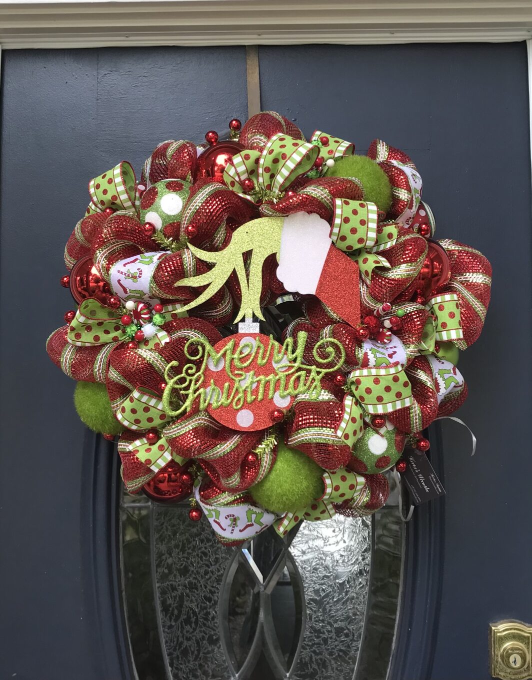 This 24 inch deluxe mesh wreath has a grinch hand holding an ornament that says, Merry Christmas” in the middle surrounded with decorative ornaments and ribbon all through the wreath.