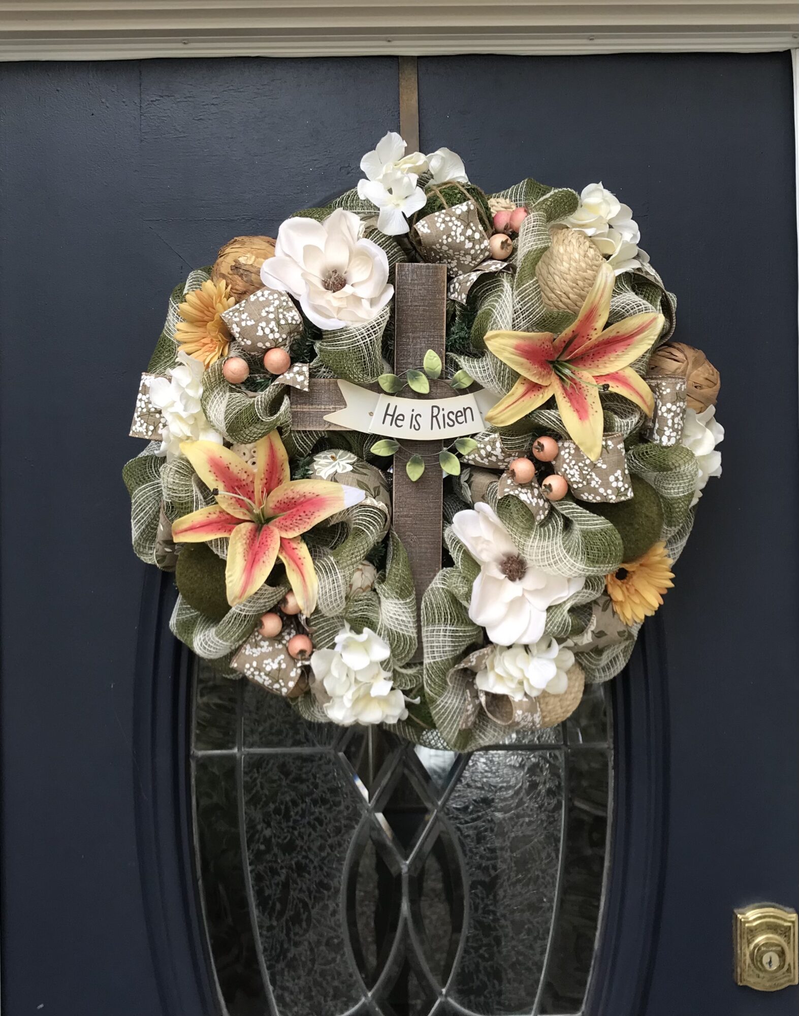 This deluxe green and ivory plaid mesh wreath that has a cross in the middle that says, “He Has Risen” on it surrounded with lilies, decorative flowers and decorative ribbon all through the wreath.