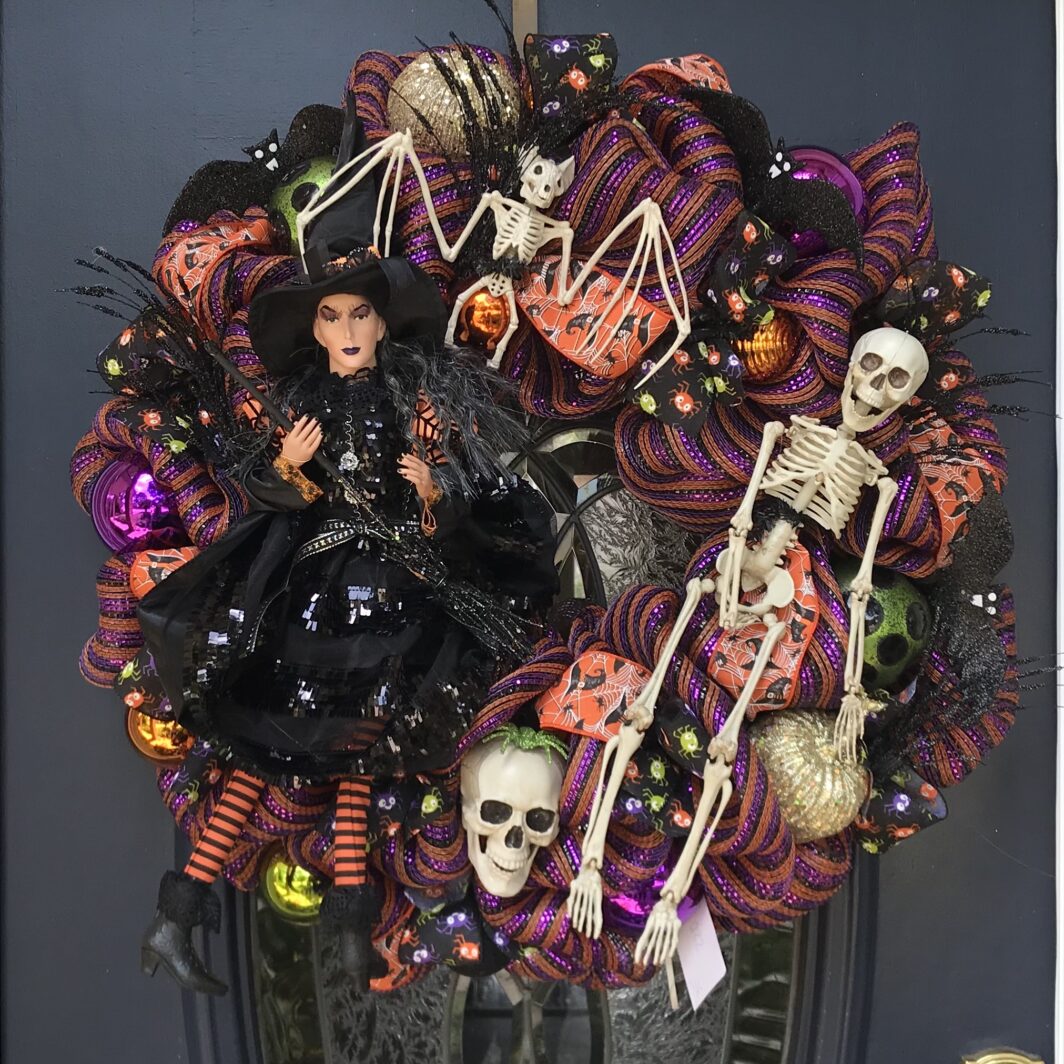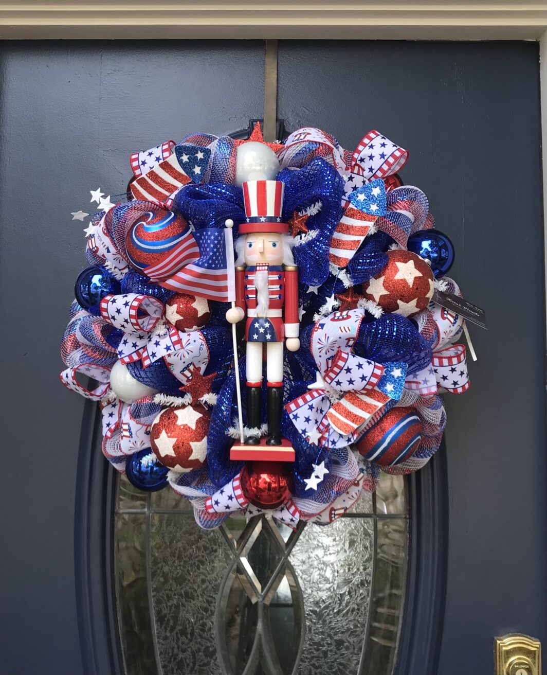 This 24 inch deluxe royal blue and stripe mesh wreath has a Uncle Sam Nutcracker in the middle surrounded with decorative star balls firecrackers and decorative ribbon all through the wreath.