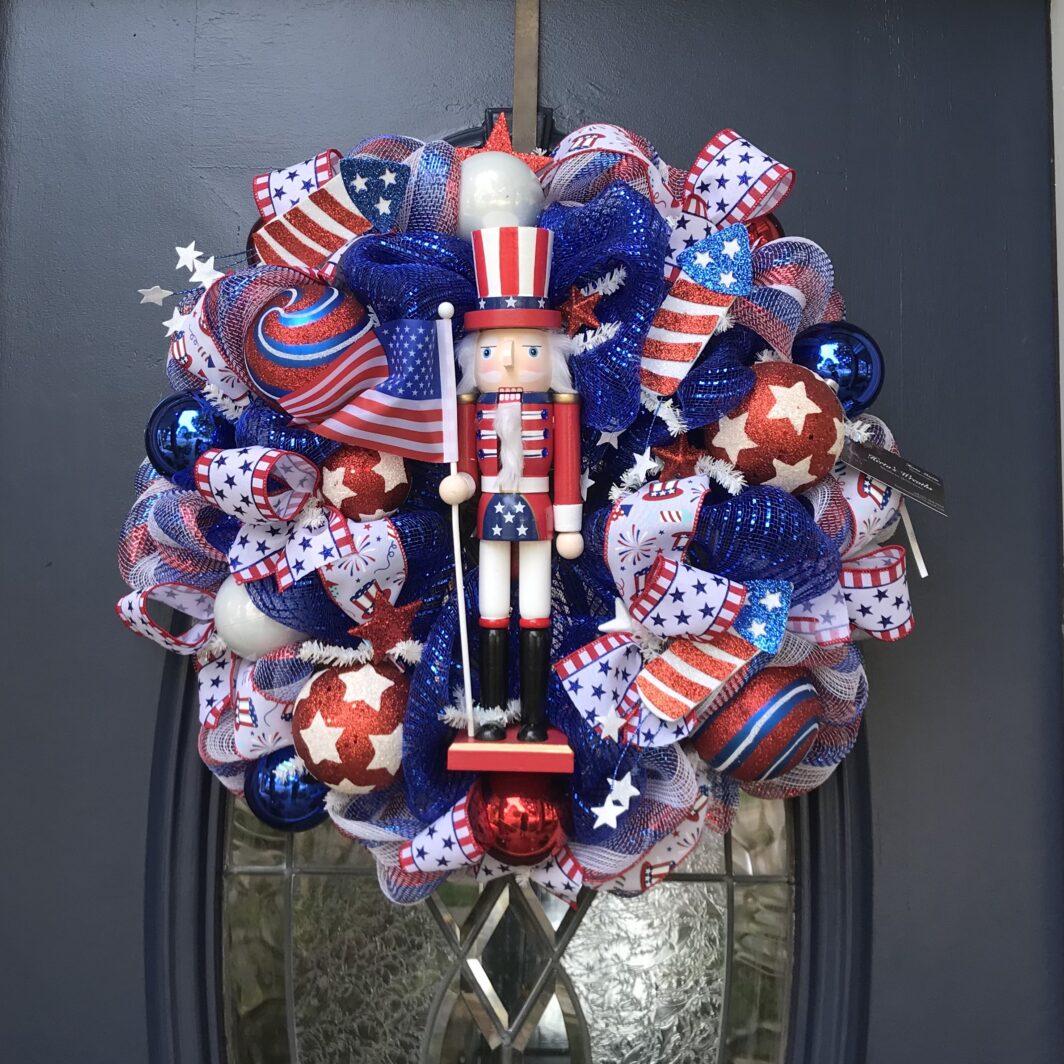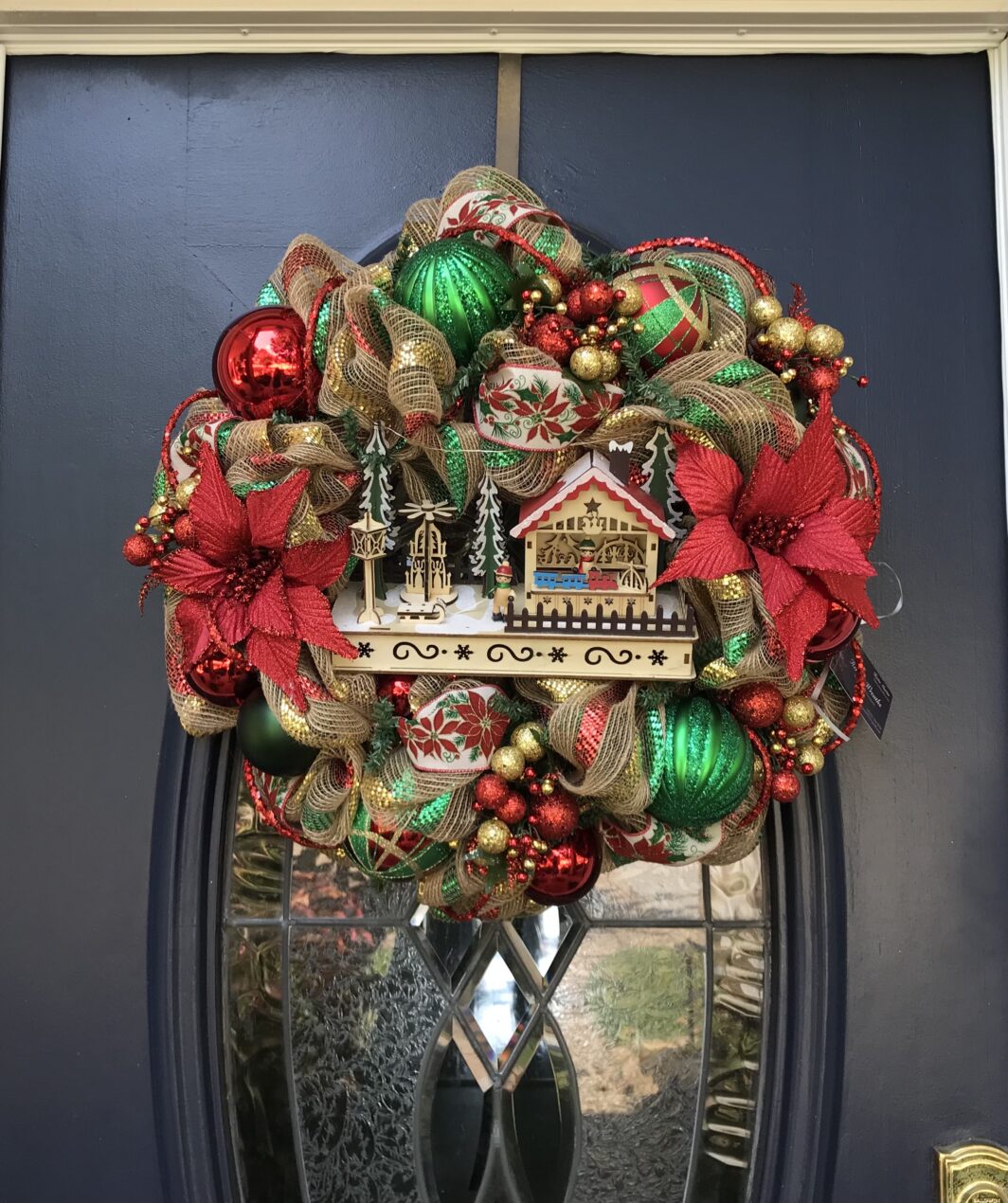 This 24 inch khaki with red and emerald green stripe mesh wreath has a cute holiday scene in the middle that lights up.