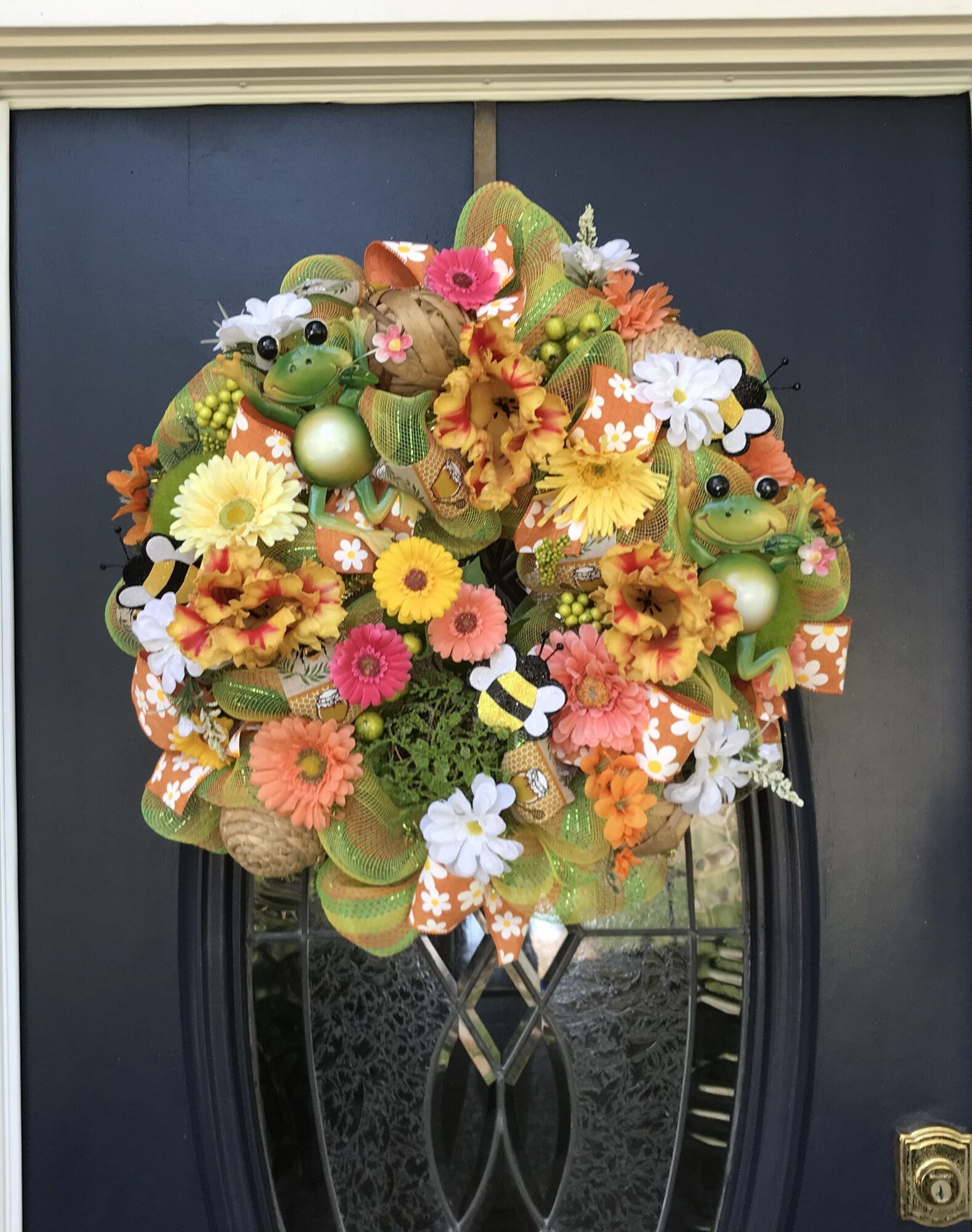 This 24 inch deluxe stripe mesh wreath has lots of colorful flowers, cute metal frogs, bumble bees and decorative ribbon all through the wreath.