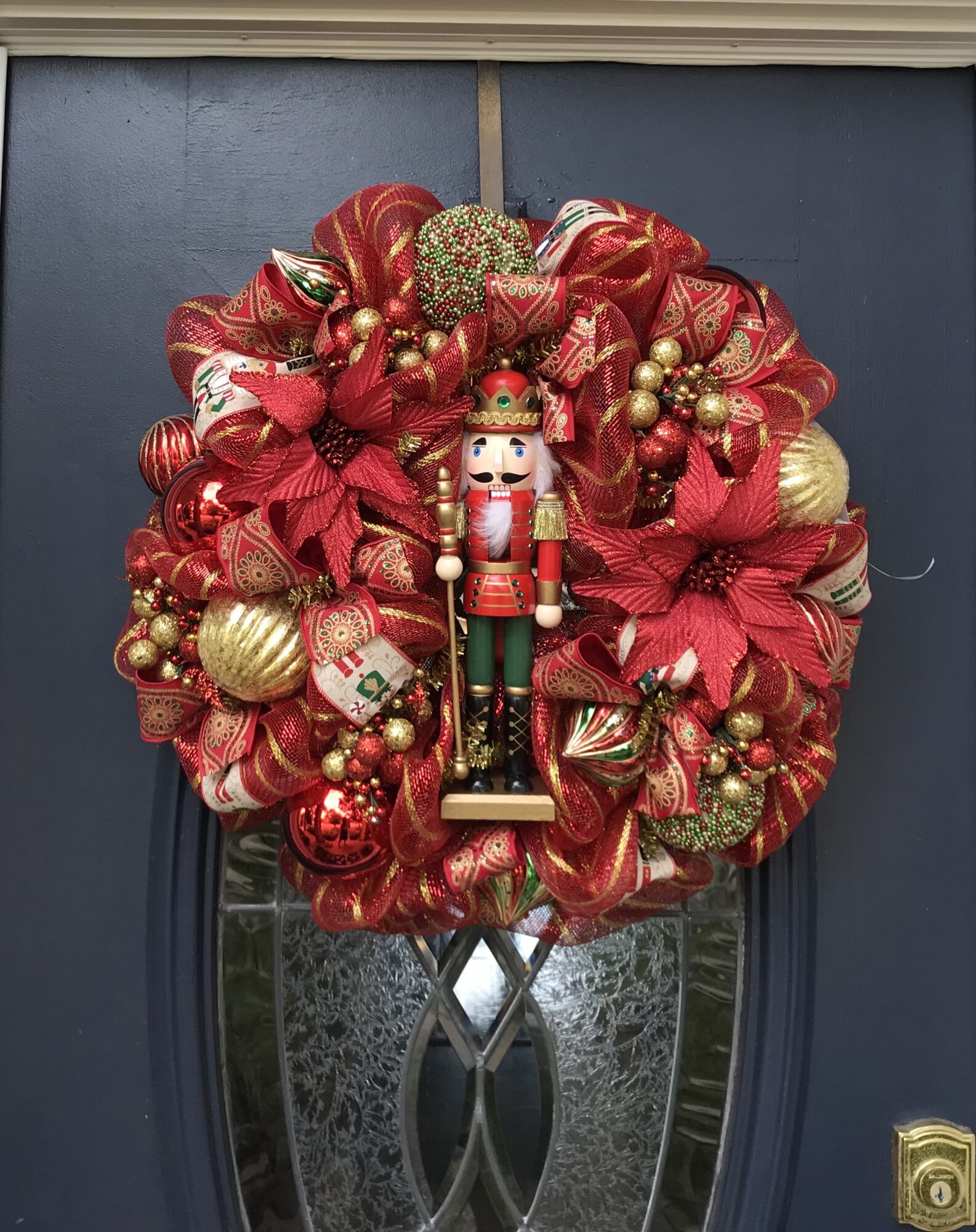 This 24 inch deluxe red and gold stripe mesh wreath has a traditional nutcracker in the center surrounded with elegant poinsettias, decorative balls and decorative nutcracker ribbon all through the wreath.