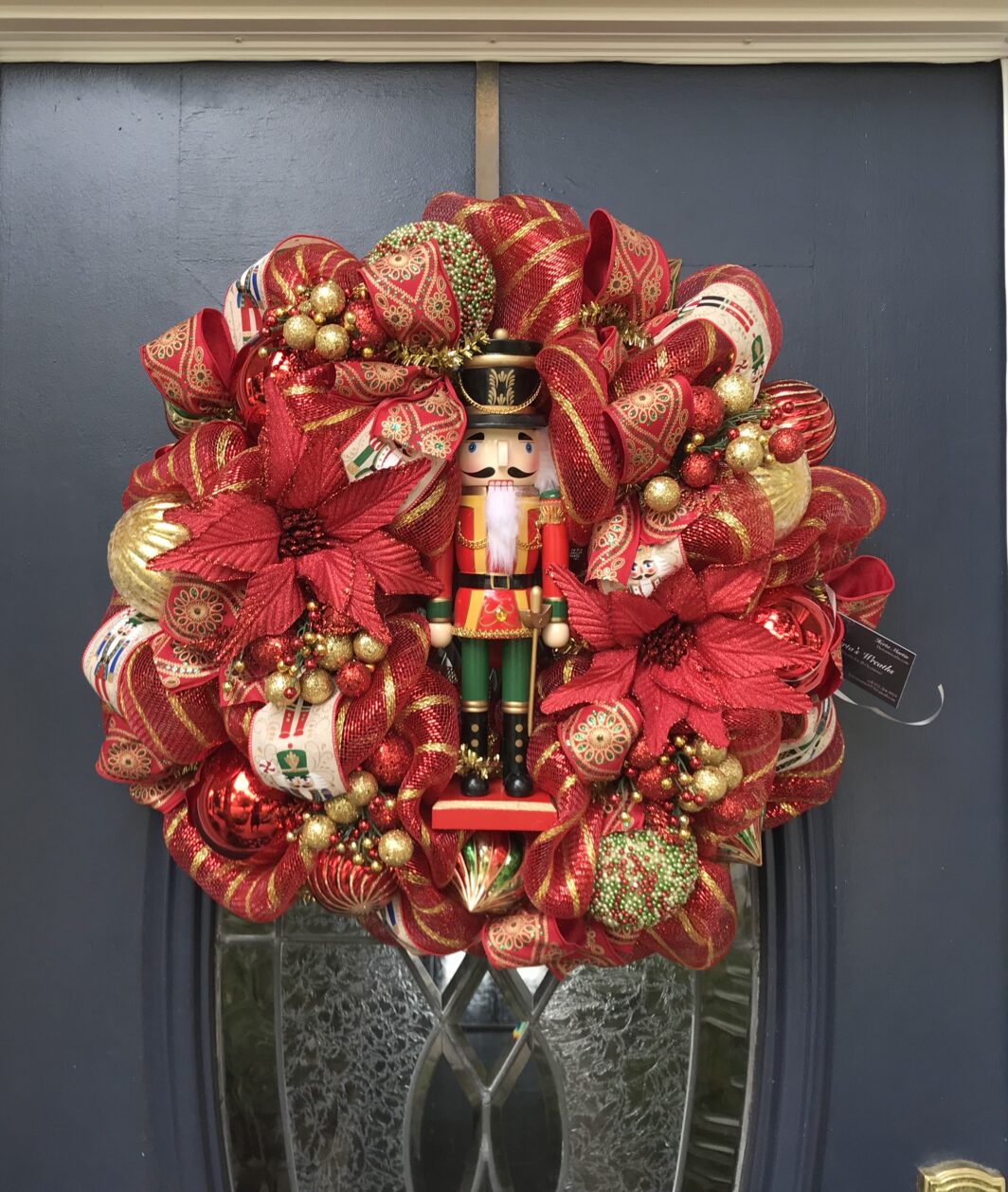 This 24 inch deluxe red and gold stripe mesh wreath with a handsome nutcracker wearing a black helmet with poinsettias, decorative balls and decorative nutcracker ribbon all through the wreath.