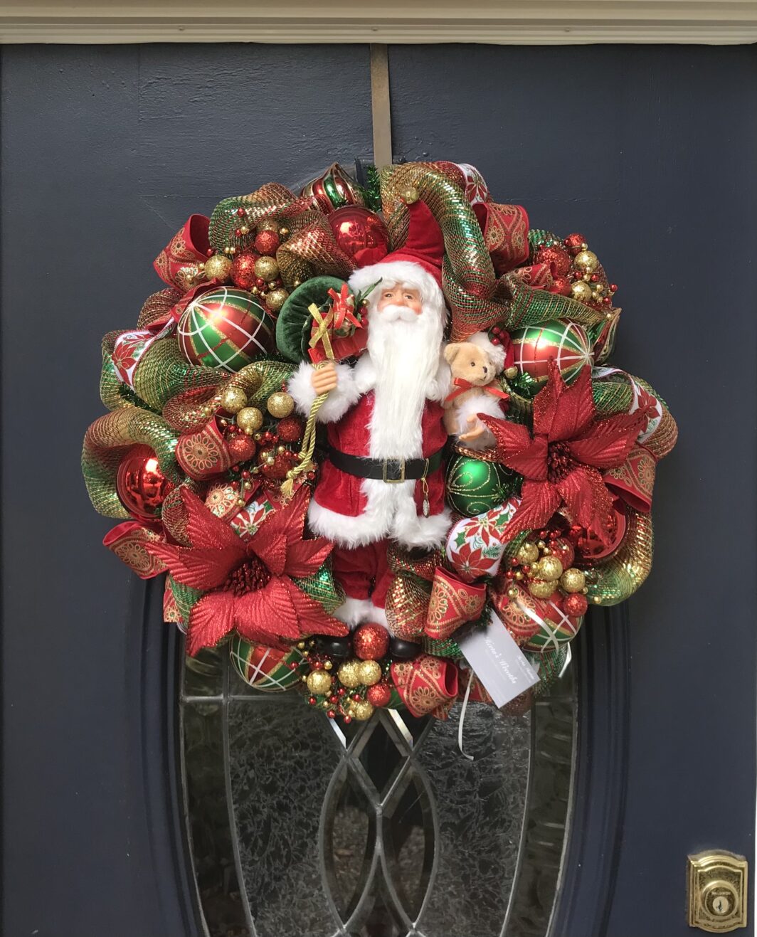 This 24 inch deluxe mesh wreath with a traditional Santa holding his teddy, poinsettias, decorative balls and ribbon all through the wreath.