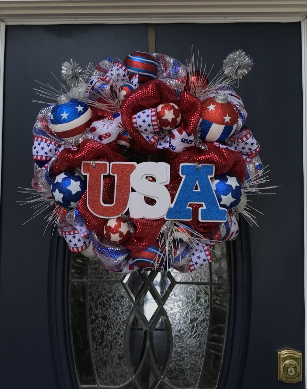 This 24 inch deluxe royal blue and stripe mesh wreath has a big USA sign in the middle with patriotic ornaments and ribbon all through the wreath.