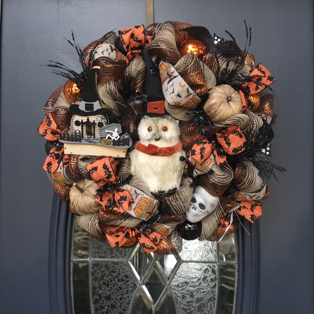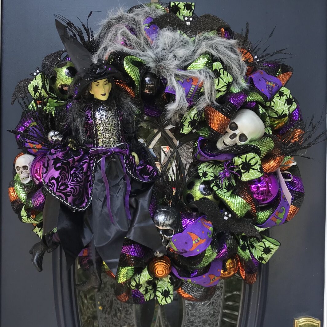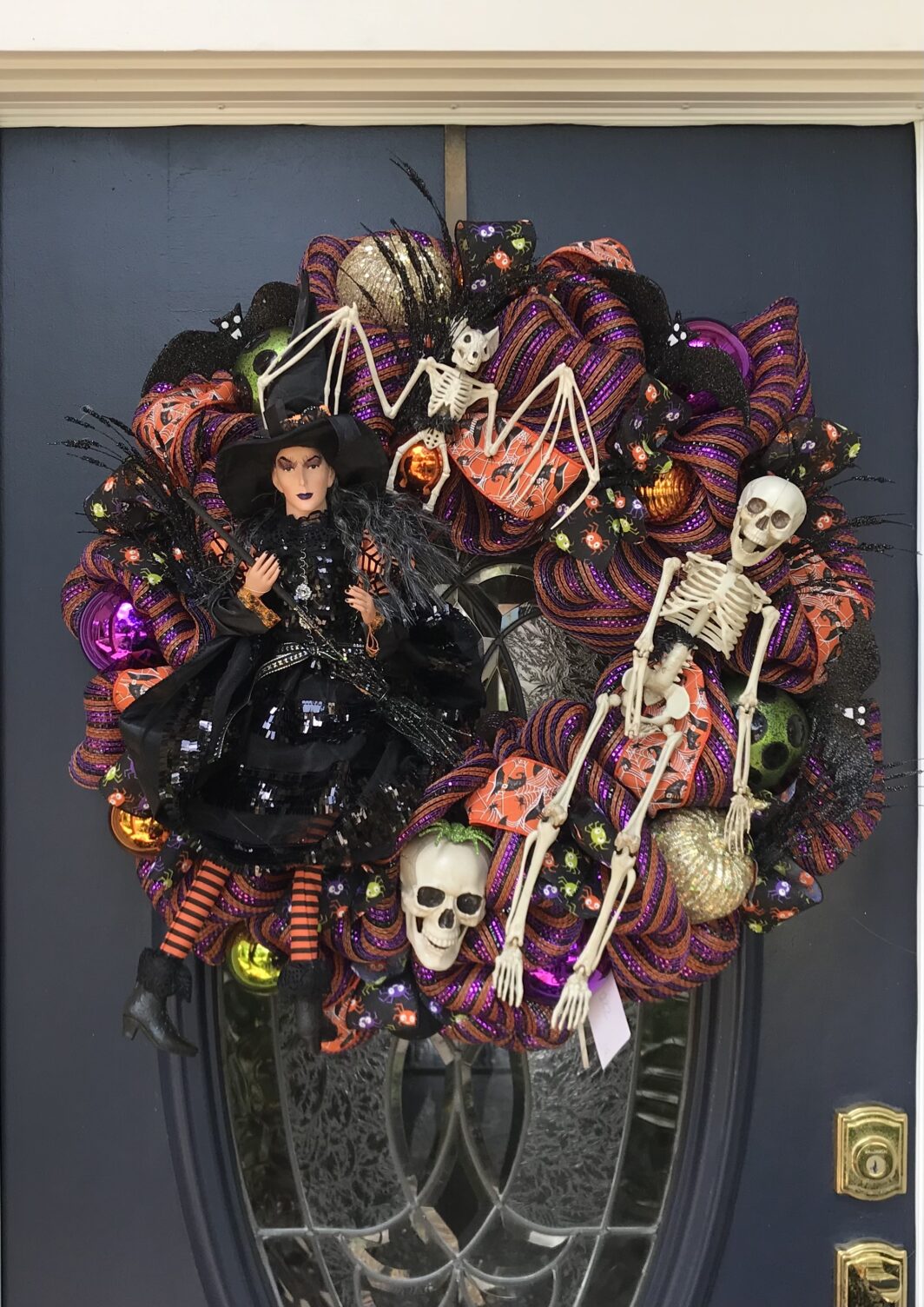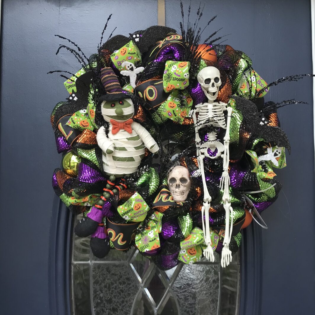 This 30 inch deluxe orange and purple stripe mesh wreath has a well dressed with h and a scary skeleton in it surrounded red with bats, skulls and decorative ribbon.