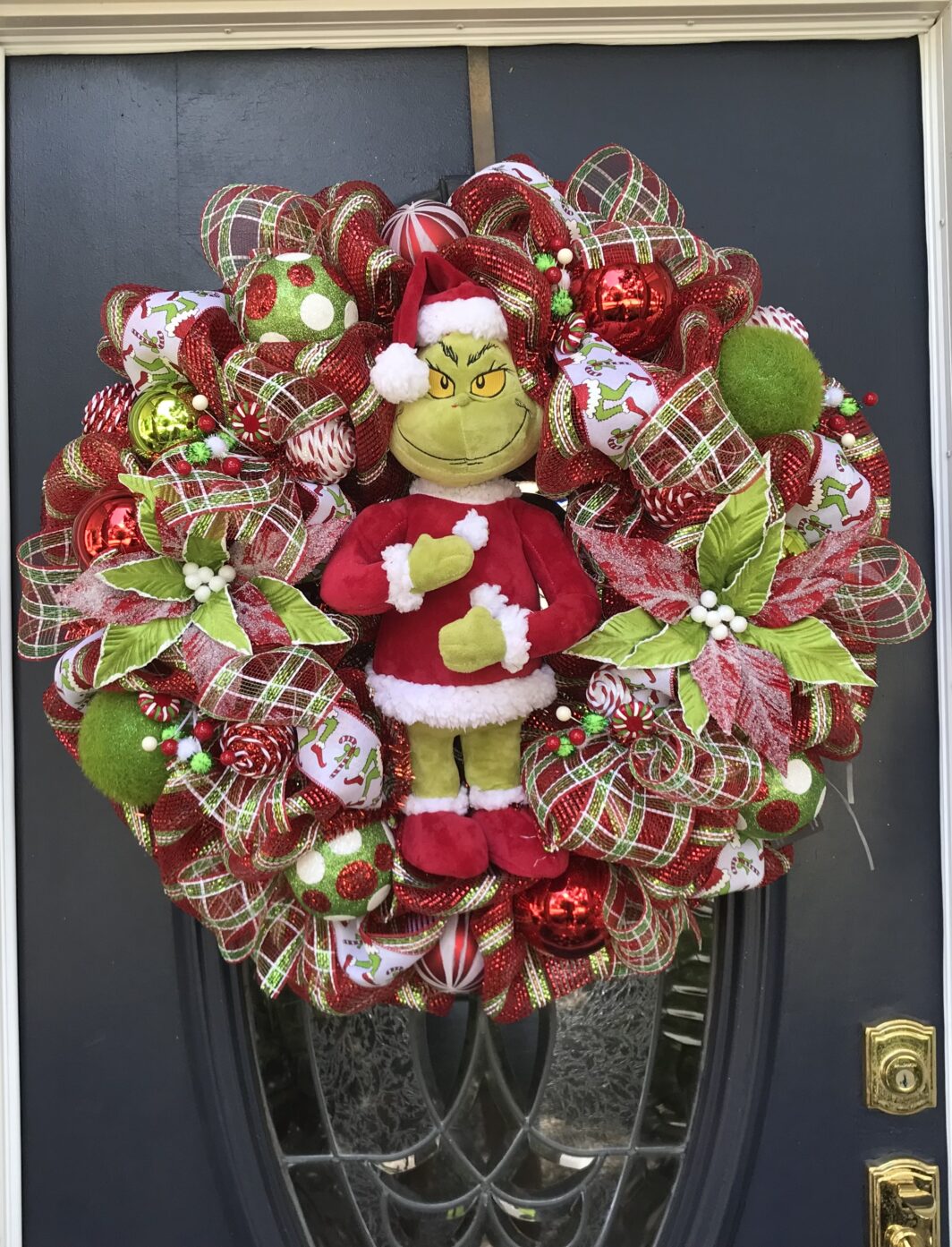 This 30 inch deluxe mesh wreath has a cute Grinch in the middle with whimsical poinsettias, decorative balls and decorative ribbon all through the wreath.