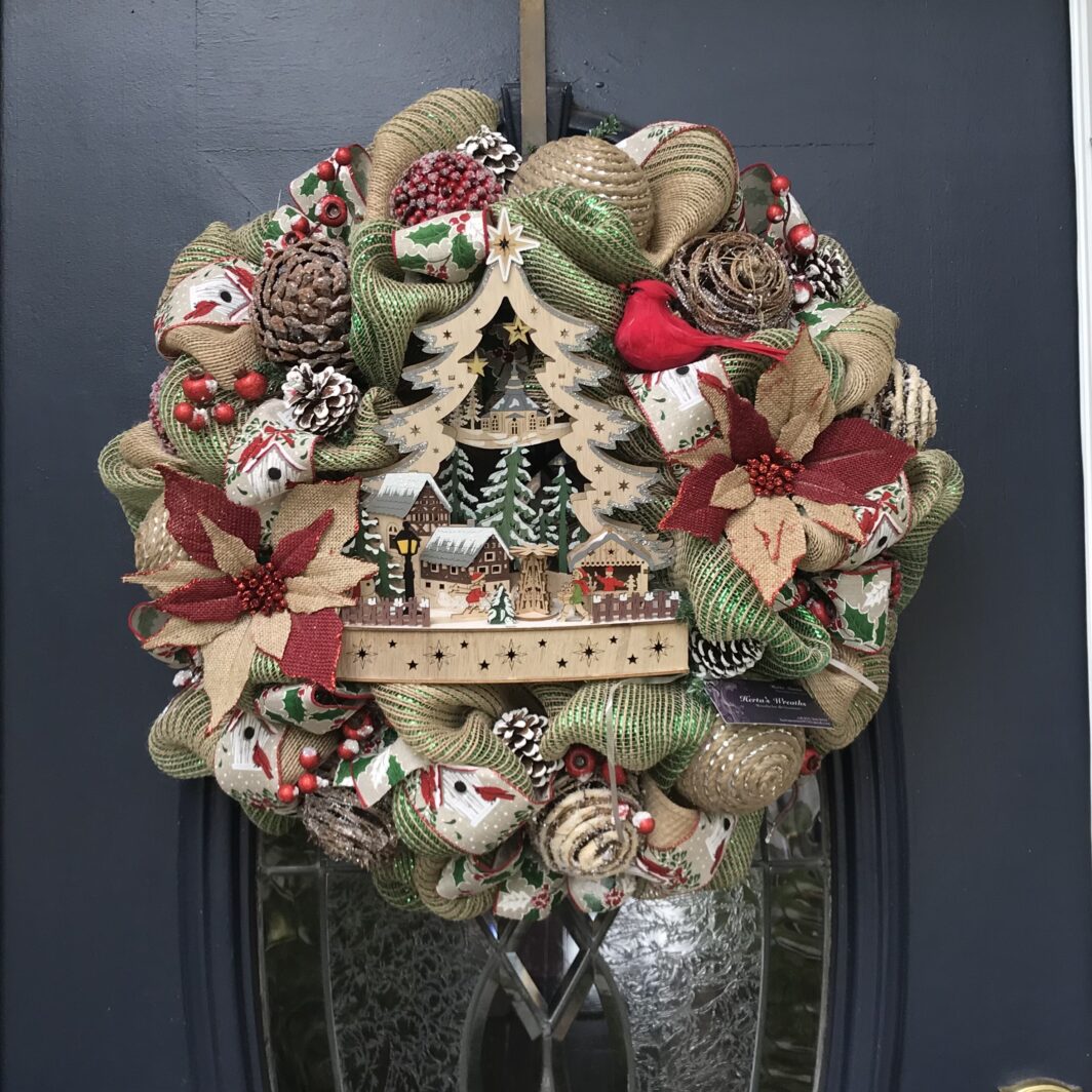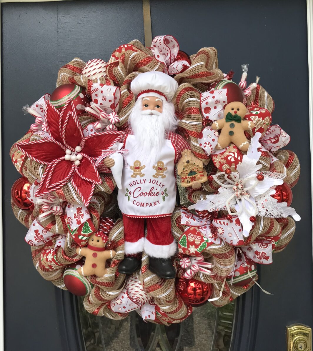 This 40 inch deluxe khaki, red and white stripe mesh wreath has a cheffSanta in the center with whimsical poinsettias, gingerbread men, decorative balls and decorative ribbon all through the wreath.