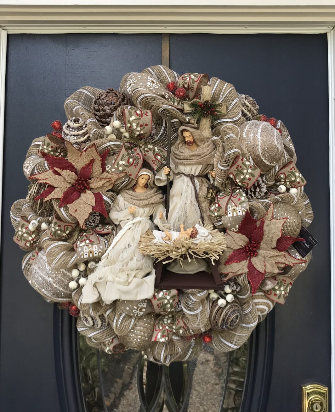This 30 inch deluxe mesh wreath has a beautiful Holy Family in the center with burlap and red poinsettias, decorative balls with decorative ribbon all through the wreath.