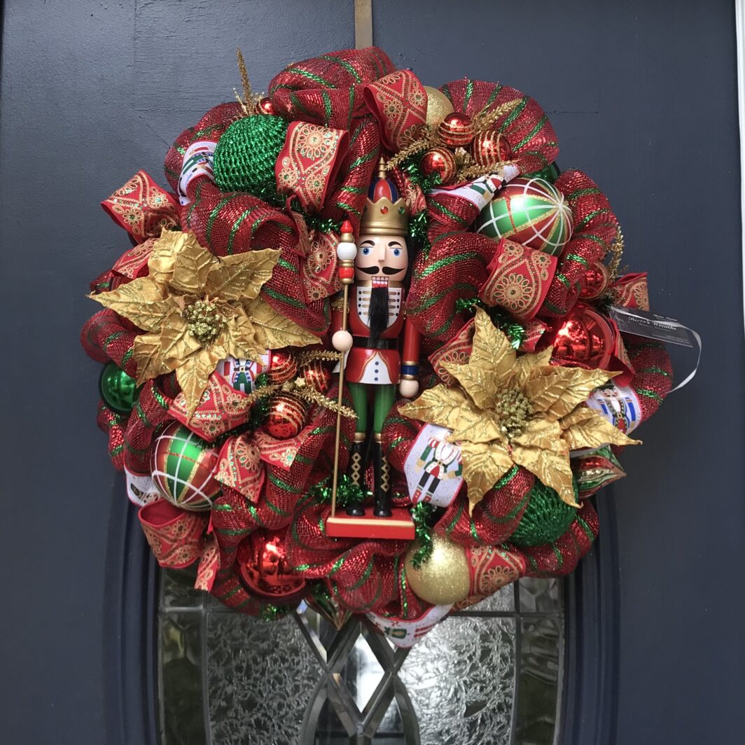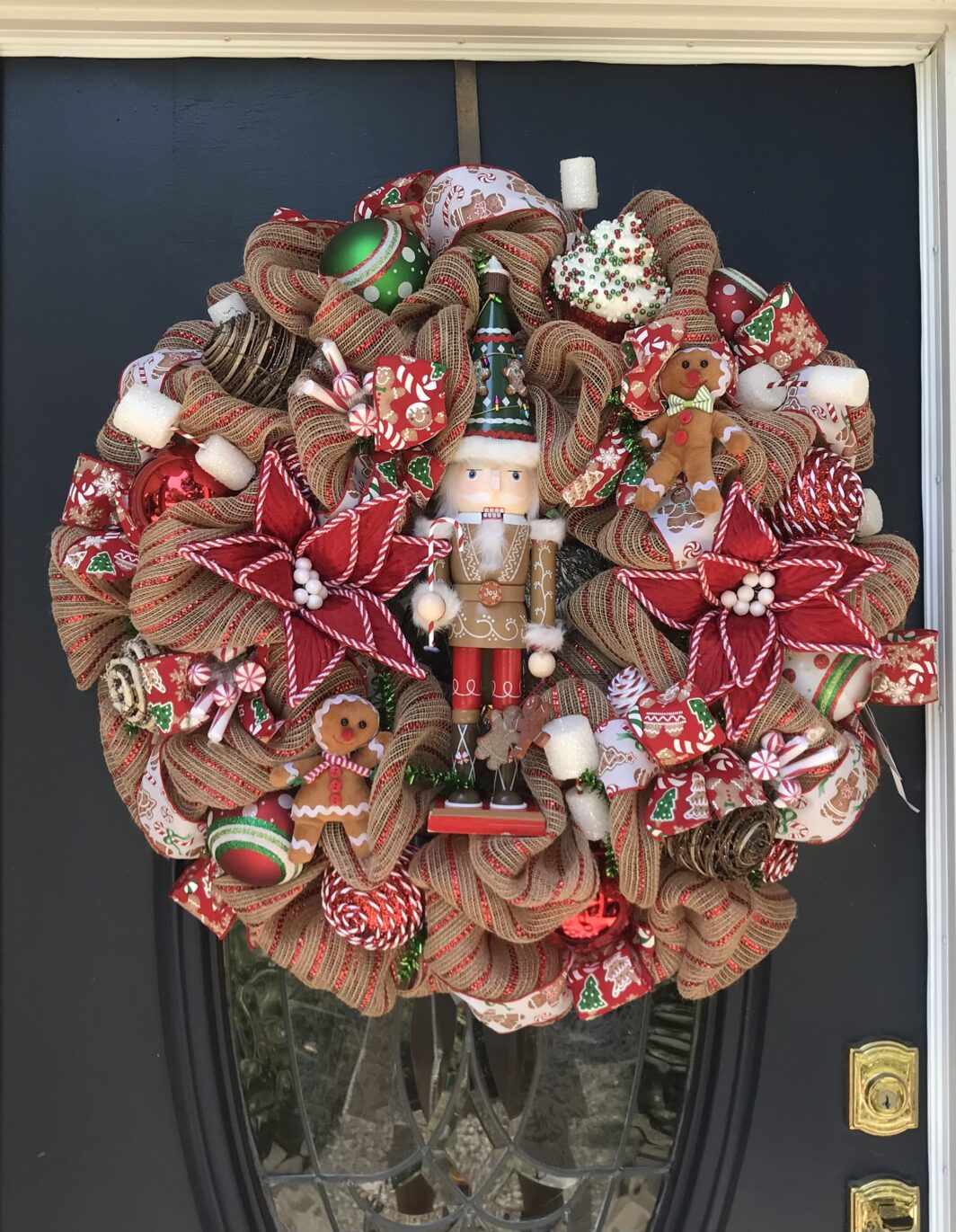This 24 inch deluxe khaki and red stripe mesh wreath has a decorative nutcracker in the middle with poinsettias, gingerbread men, decorative balls and ribbon all through the wreath.
