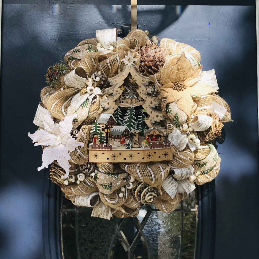 This 30 inch deluxe khaki and white stripe mesh wreath has a Cute Santa holding a Gingerbread house in the center.