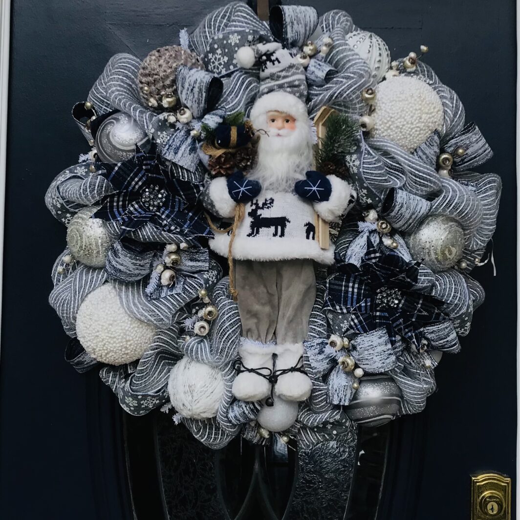 This 30 inch deluxe red white and green stripe mesh wreath has a cute Santa holding his skis with decorative poinsettias, balls and ribbon all through the wreath.