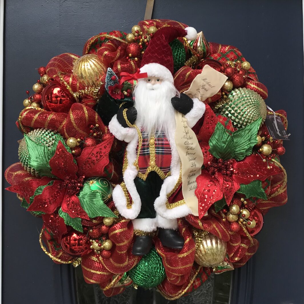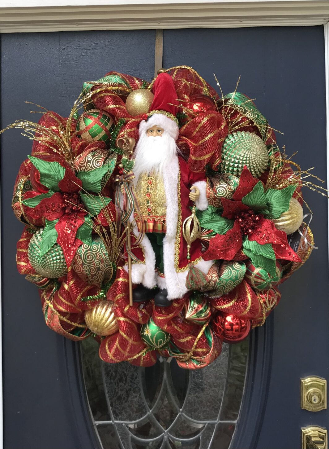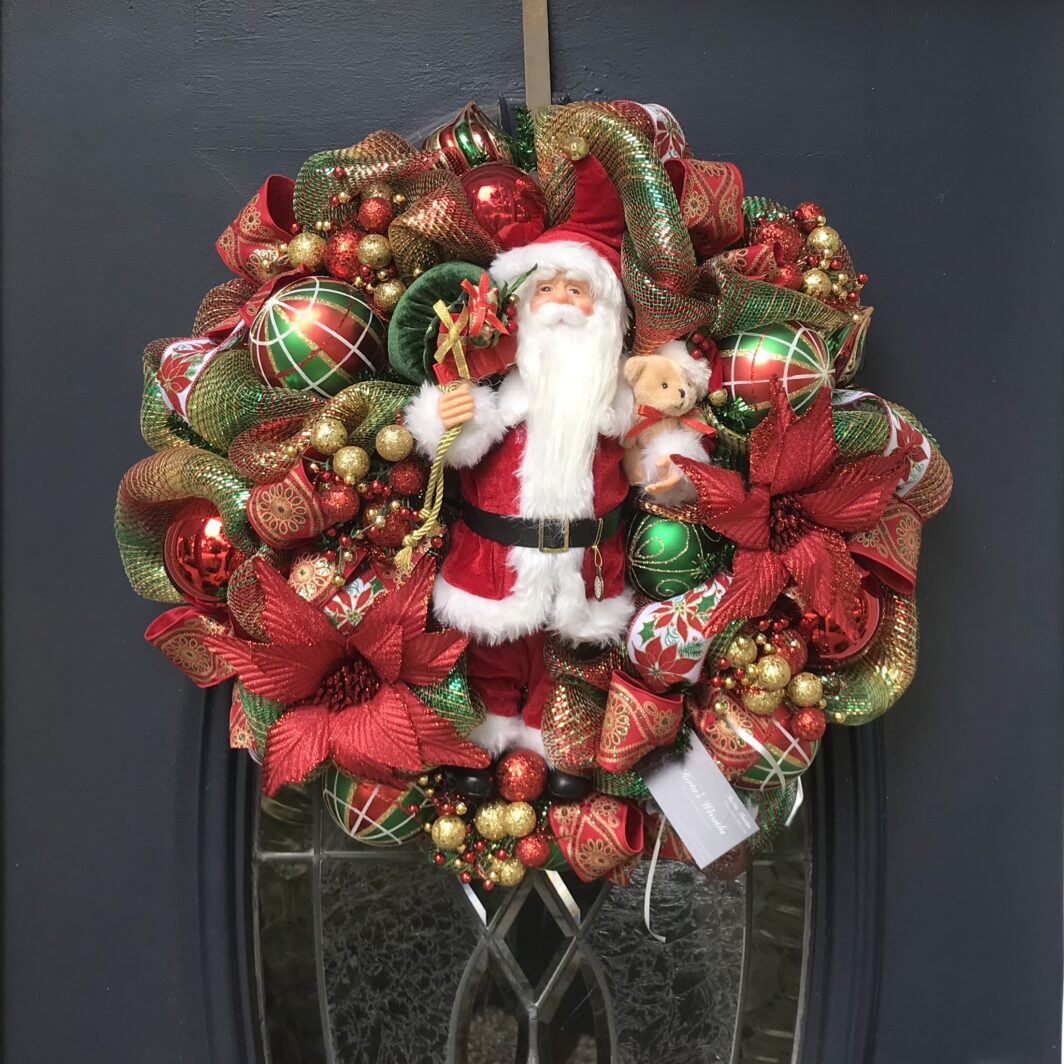 This 30 inch deluxe red with gold stripe mesh wreath has a very elegant Santa wearing a gold vest in the center surrounded with poinsettias, decorative balls and decorative ribbon all through the wreath.