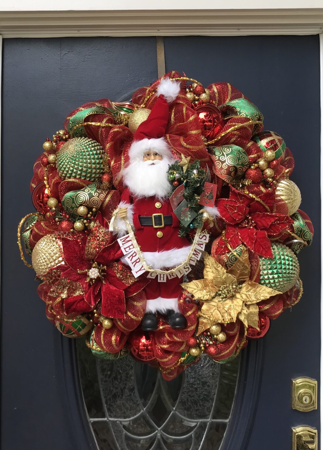 This 30 inch deluxe red and gold stripe mesh wreath has a Santa holding a Merry Christmas sign in the center with decorative poinsettias, decorative balls and ribbon all through the wreath.