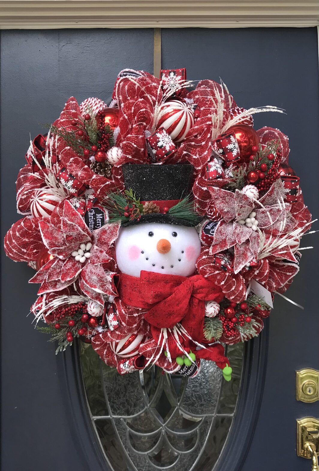 This 30 inch deluxe red and white popcorn mesh wreath has a snowman in the center wearing his black top hat with poinsettias, decorative balls and ribbon all through the wreath.
