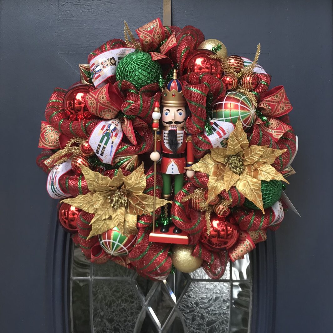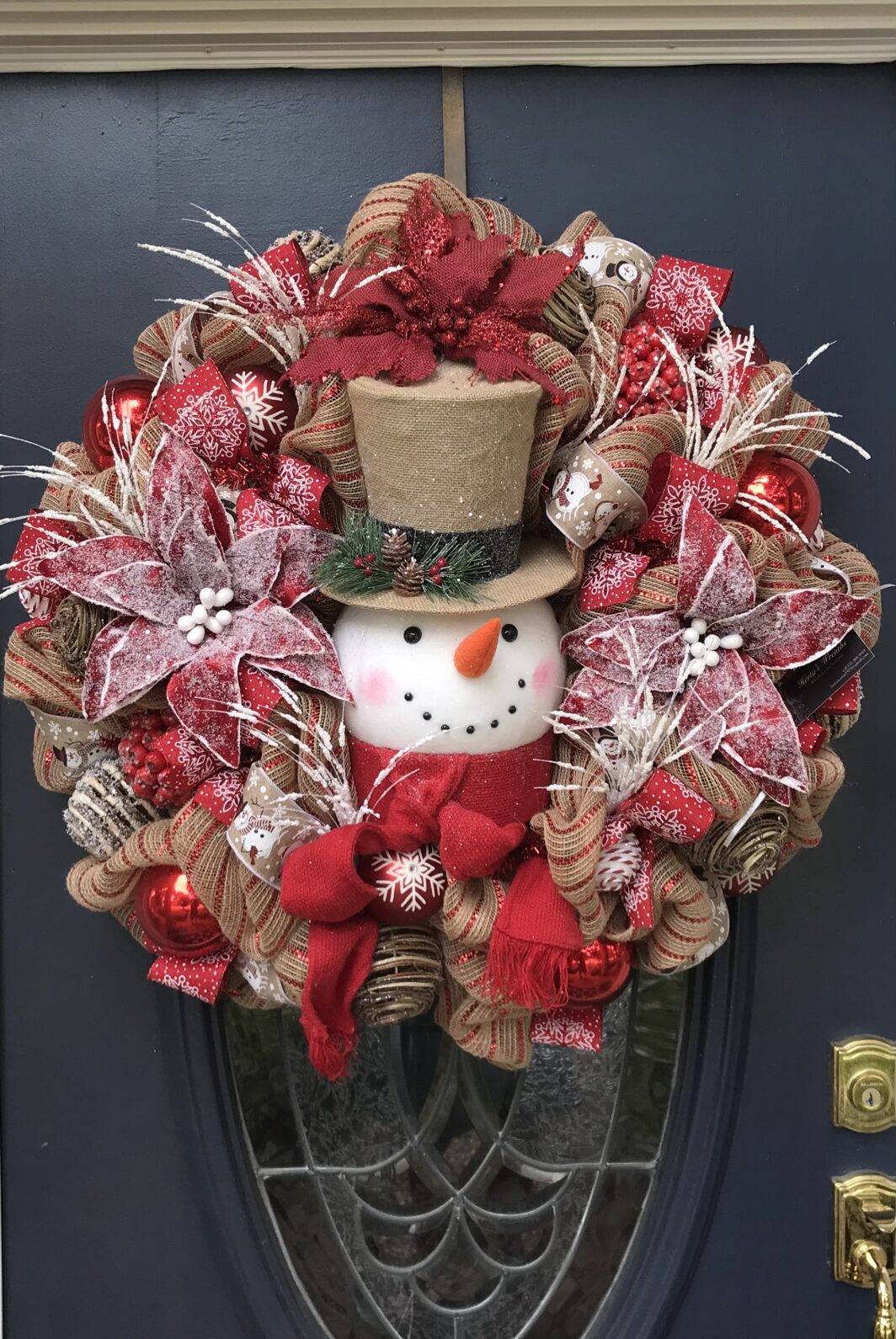This 30 inch deluxe khaki and red stripe mesh wreath has a snowman wearing a burlap top hat in the middle surrounded with decorative poinsettias, decorative wooden balls and glitter picks all through the wreath.
