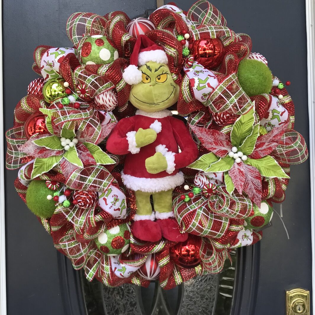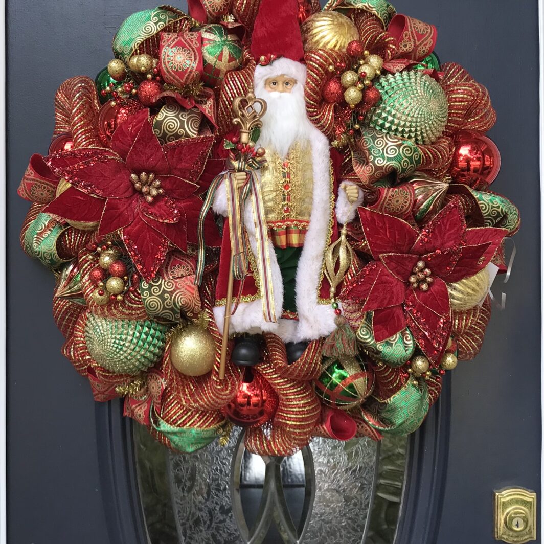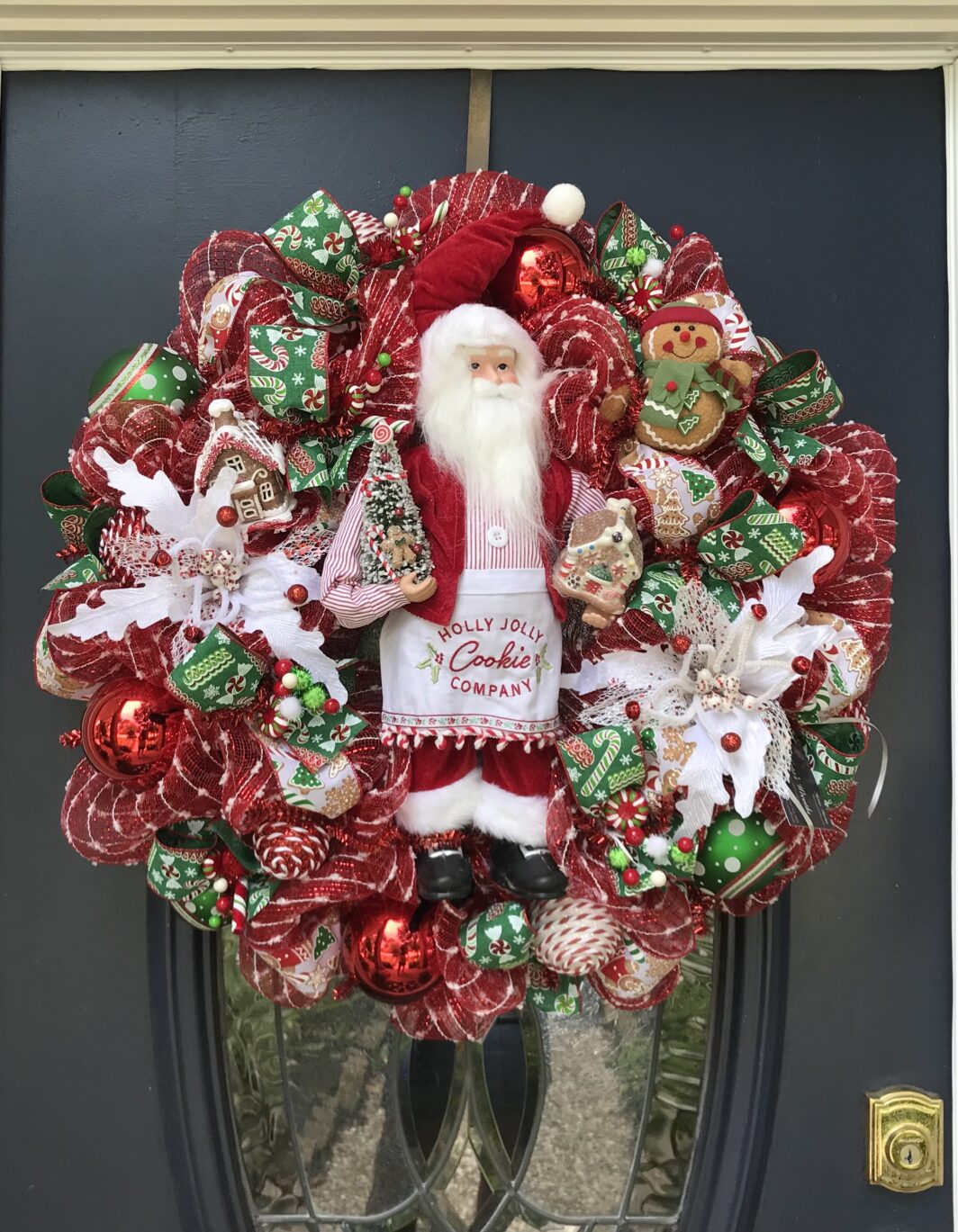 This 30 inch deluxe mesh wreath has a Cookie Company Chef Santa in the middle surrounded with traditional color ribbon all through the wreath.
