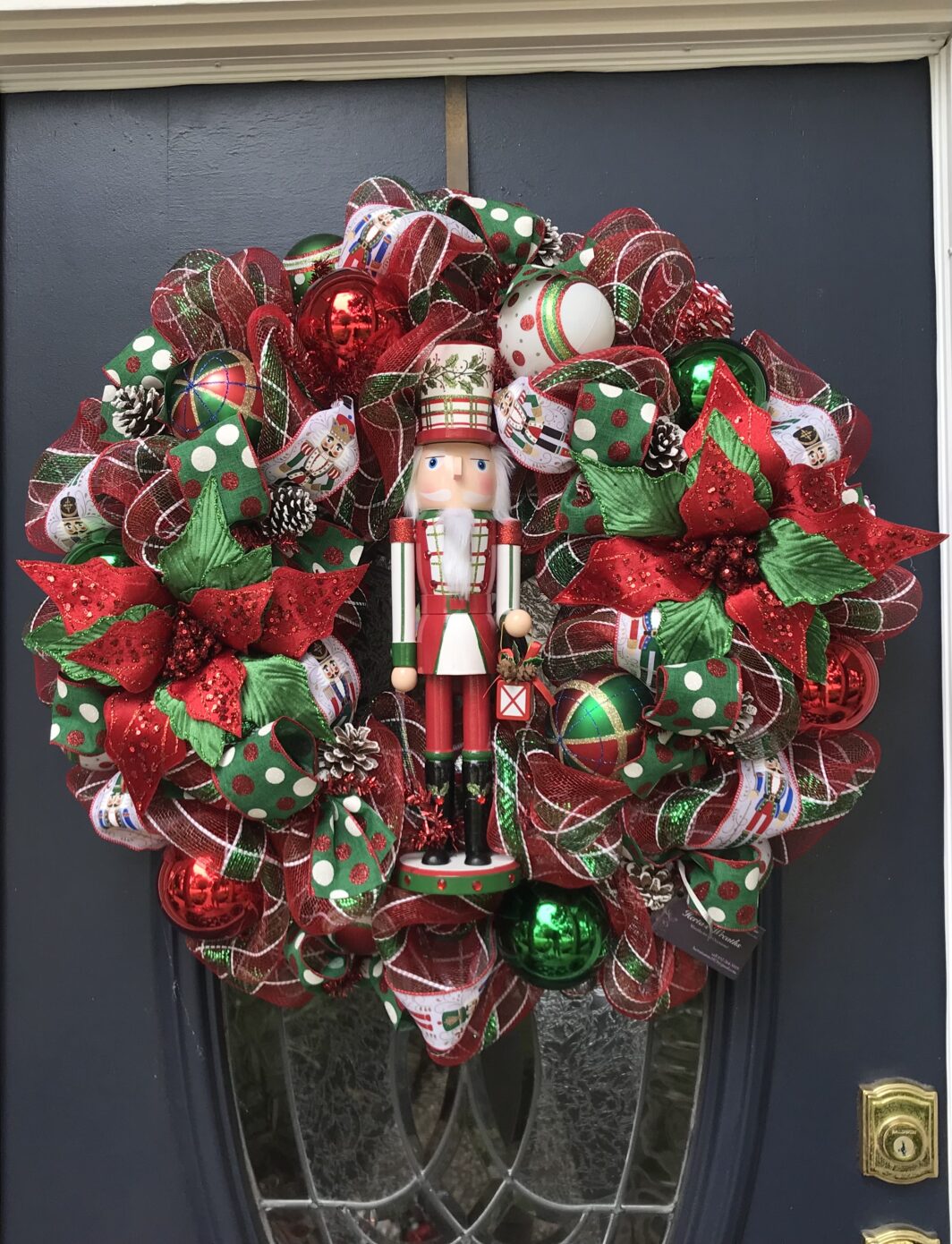 This 30 inch deluxe red, emerald green and white check mesh wreath has a traditional Nutcracker in the middle with elegant poinsettias, decorative balls and decorative ribbon all through the wreath.