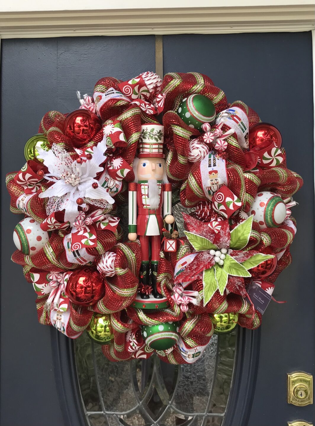 This 30 inch deluxe red stripe mesh wreath has a Fabulous nutcracker in the middle with whimsical poinsettias, decorative balls, peppermint candy and decorative ribbon all through the wreath.