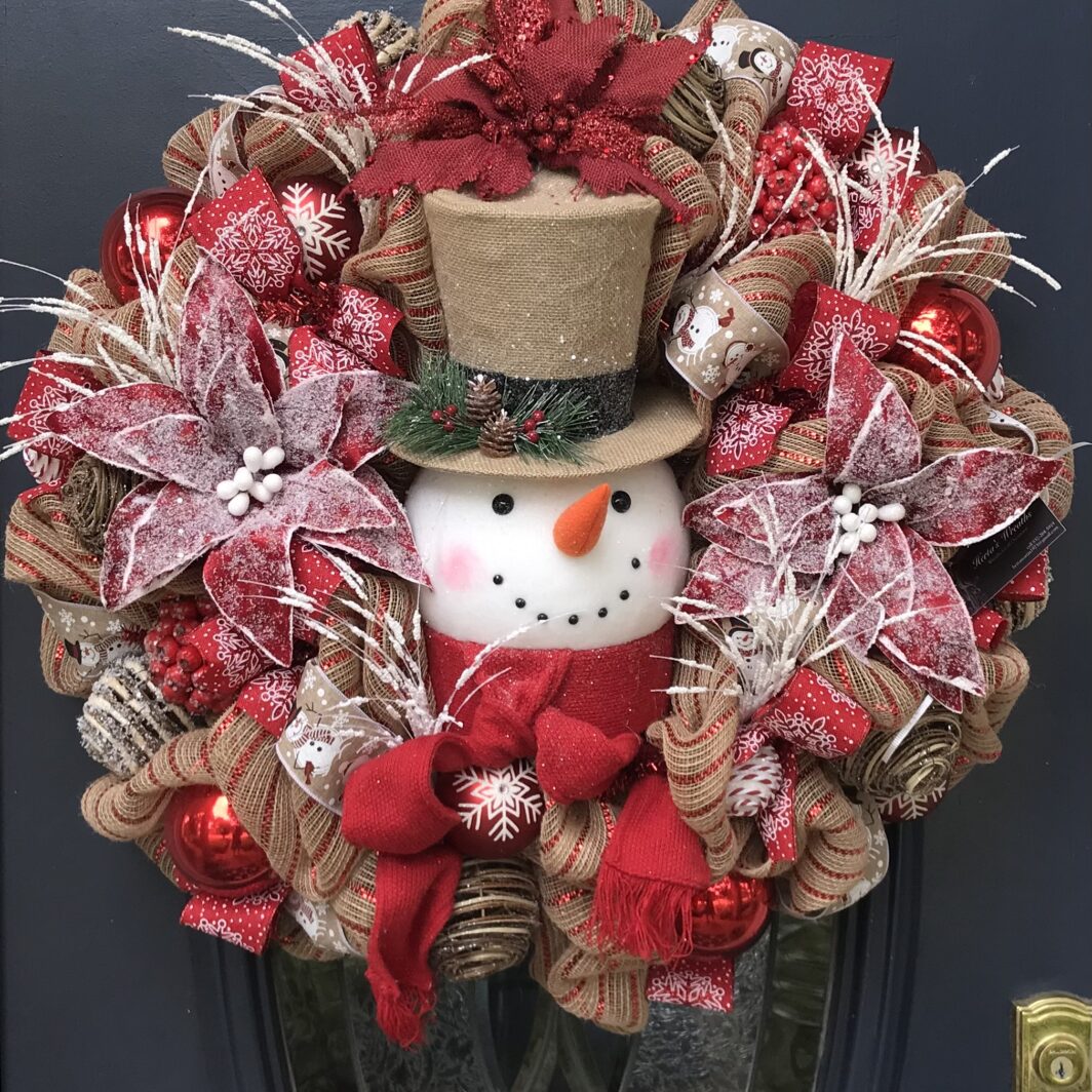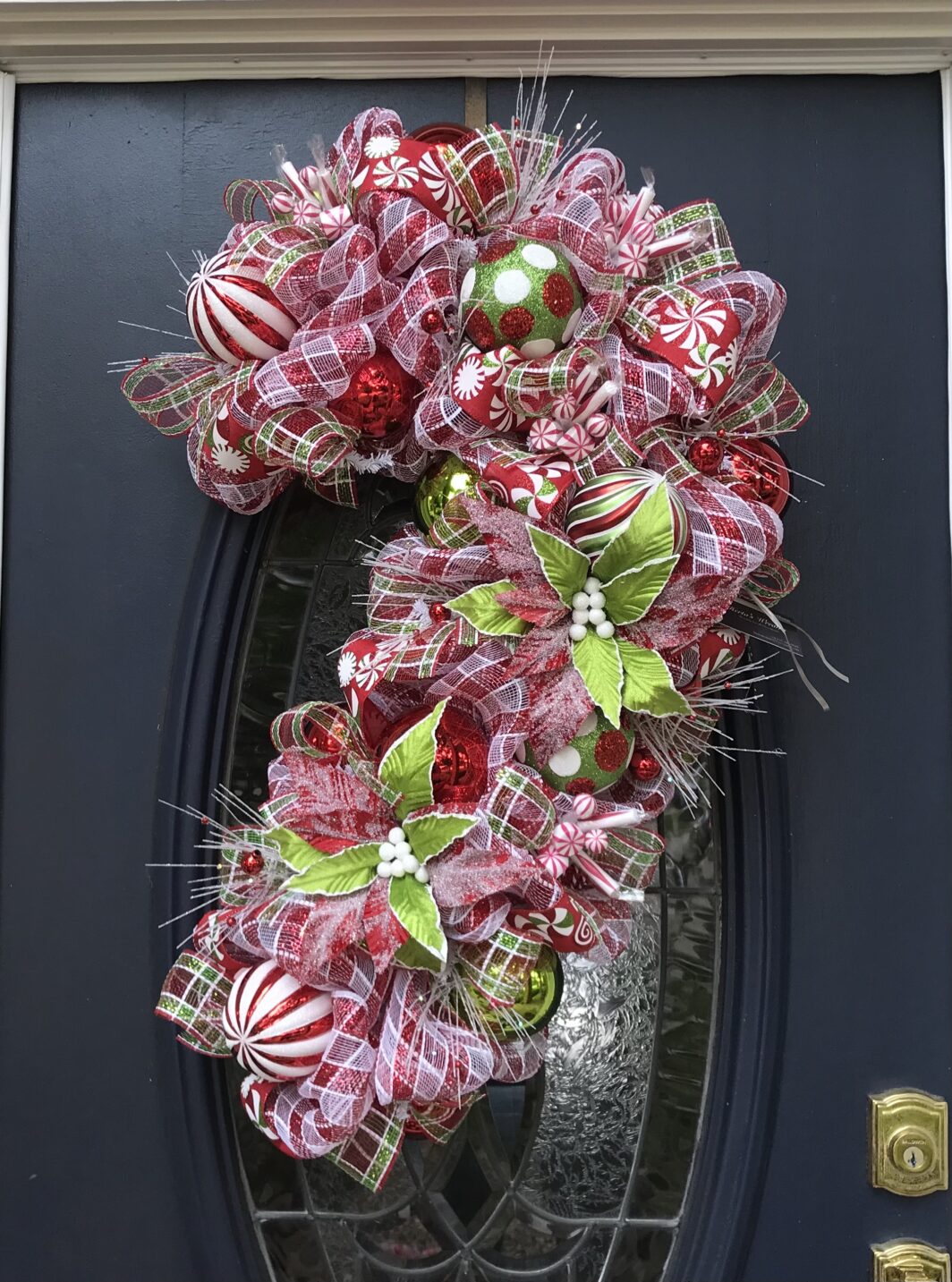 This deluxe red and white plaid mesh wreath is in the shape of a candy cane with whimsical poinsettias, decorative balls and glitter picks all through the wreath.